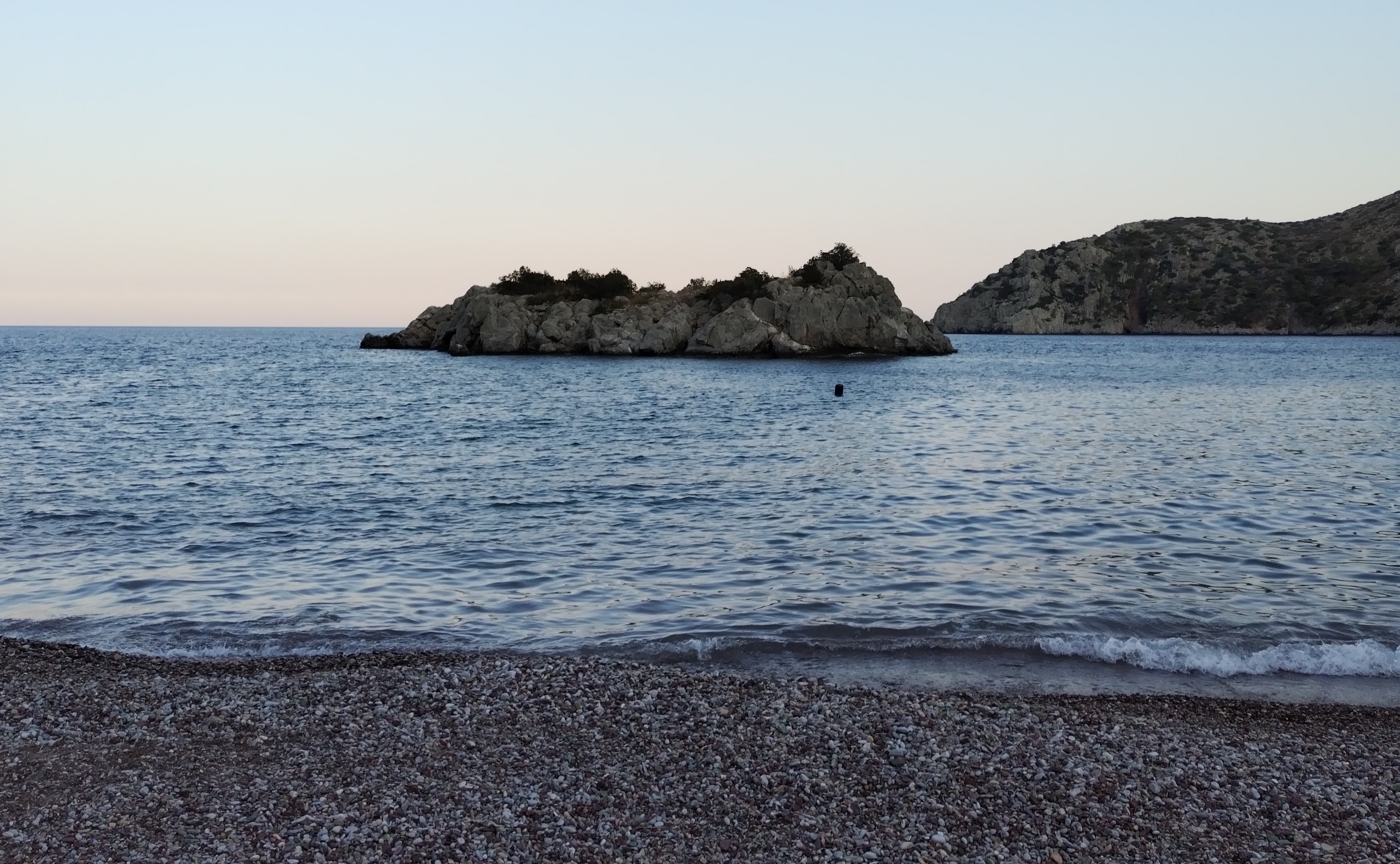 Por supuesto que no hicimos eso. Una vez abajo, nos quedamos platicando frente a la playa unos 15 minutos, luego todos nos metimos a nadar. Vasilis fue el único en nadar hasta el islote frente a la playa, antes del mar abierto. Dijo que estaba repleto de erizos. Luego nos quedamos en la playa otros 20 minutos, platicando y haciendo torrecillas de piedras. Vimos el cielo tornarse de un azul oscuro y luego gris hasta que finalmente se hizo negro, pero lleno de estrellas. Fue el otro lado de un atardecer que otros disfrutaron en las playas de la costa más poblada.