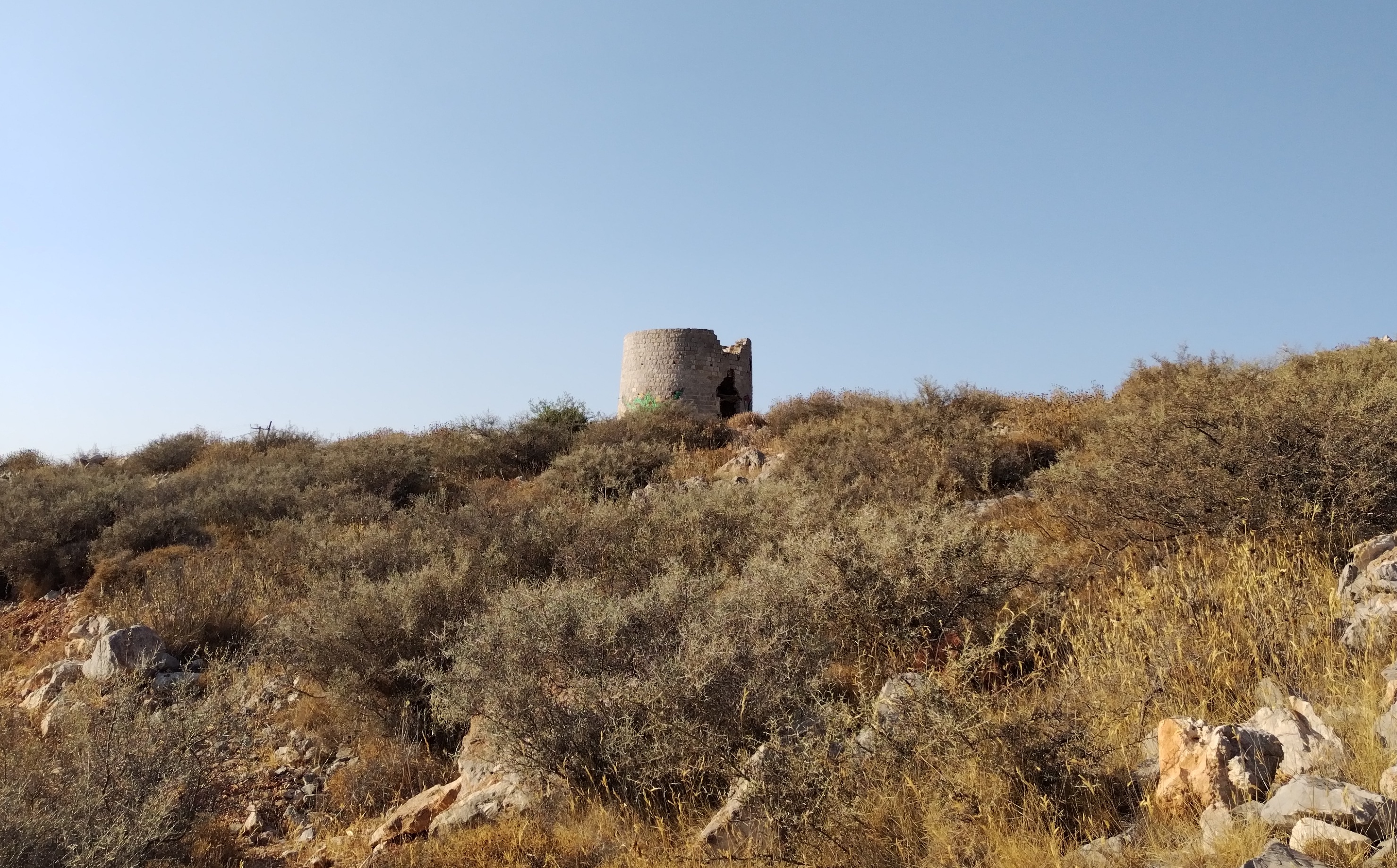 Para cuando llegué al tope de las colinas, justo a la mitad de la isla, podía ver todo el pueblo, el puerto, junto con el sol descendiendo. En las colinas, no había mucho más que una mini torre de ladrillo parcialmente destruída y grafiteada. No parecía servir otro propósito más que proveer un poco de sombra para el excursionista ocasional. Aquí vi al único otro ser humano que había visto en poco más de tres cuartos de hora.