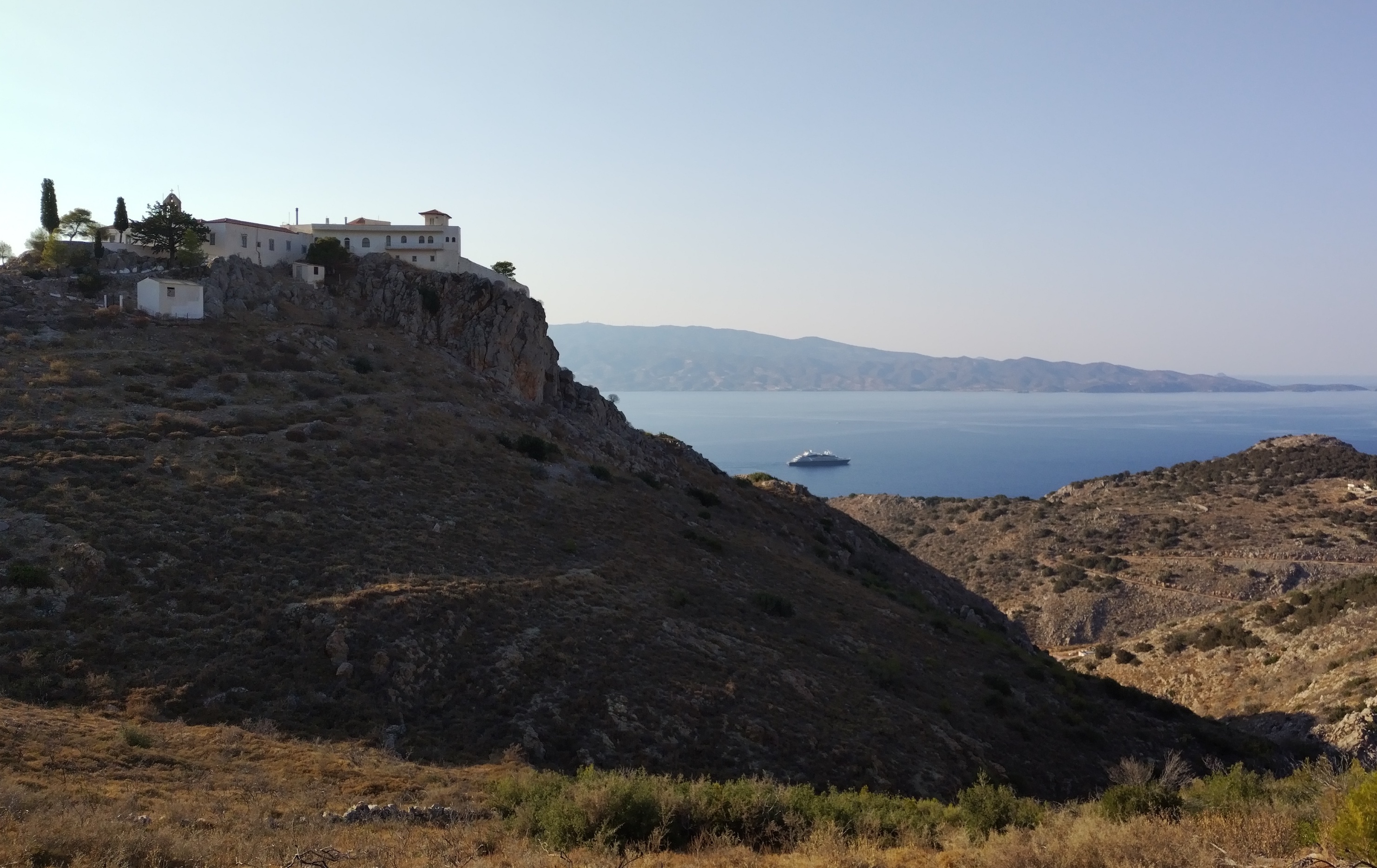 Estuve un tiempo tratando de dilucidar algún camino hacia abajo hasta que me di cuenta de la hora. Eran pasadas las 7:30. Como el atardecer suele ser a las 8:40, pensé que o encontraba una ruta pronto y volvía a subir inmediatamente, o me perdía el atardecer y caminaba de vuelta en la oscuridad. Llegué al final del único sendero y solo encontré un árbol, al tope de otro risco, del cual no había ningún camino viable. Miré al horizonte y pensé que si no bajaba a la playa, al menos había visto esta costa. Me di cuenta de que al estar en el lado sur de la isla, ahora el horizonte que podía ver era con dirección al resto del Egeo, hacia el otro extremo del Mediterráneo, las costas de Turquía, Egipto, Chipre, Israel, Palestina, el Líbano y Siria. Todos lugares a los que nunca he ido, pero quisiera. La caminata no me había llevado a tocar el agua, pero al menos había presentado la posibilidad de varios viajes futuros.